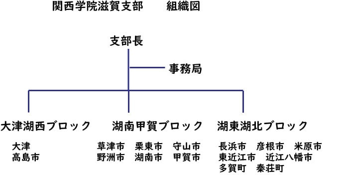 滋賀支部は1992年(平成4年)京都支部活動に参加していた先輩有志の間に滋賀支部設立の機運が高まり、京都支部の支援をいただき初代支部長柳田貞男氏(2005年物故)を中心に設立いたしました。そして1988年には現支部長藤野泰志が2代目支部長に就任いたしました。 2005年、関西学生対抗駅伝競走大会が会場をびわ湖西岸に移し「びわ湖大学駅伝」として開催されることになり、学院より応援の要請をいただきました。駅伝終了後、陸上競技部からの参加もいただき支部総会を開催。以降、毎年駅伝開催日(11月第3土曜日)に支部総会を定期開催いたしております。昨年2011年には60名を超える参加となりました。 2010年には湖北地区在住の有志による「湖東湖北KG会」も発足。本年6月の湖東湖北KG会主催懇親会には京都支部・奈良支部からも参加をいただき他支部との交流も始まろうとしています。